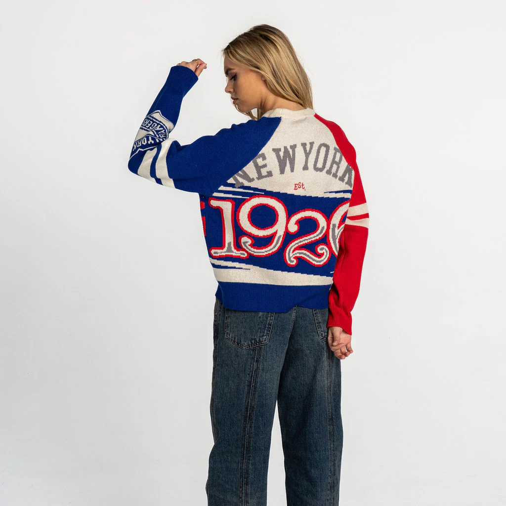 A multi-color graphic sweater featuring New York Rangers artwork for a bold, cozy look. The women’s fit delivers comfort with standout design.